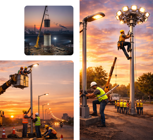 We manufacture and install a wide range of products, including High Mast Poles, GI Octagonal Poles, Street Light Poles, and specialized Stadium Poles.